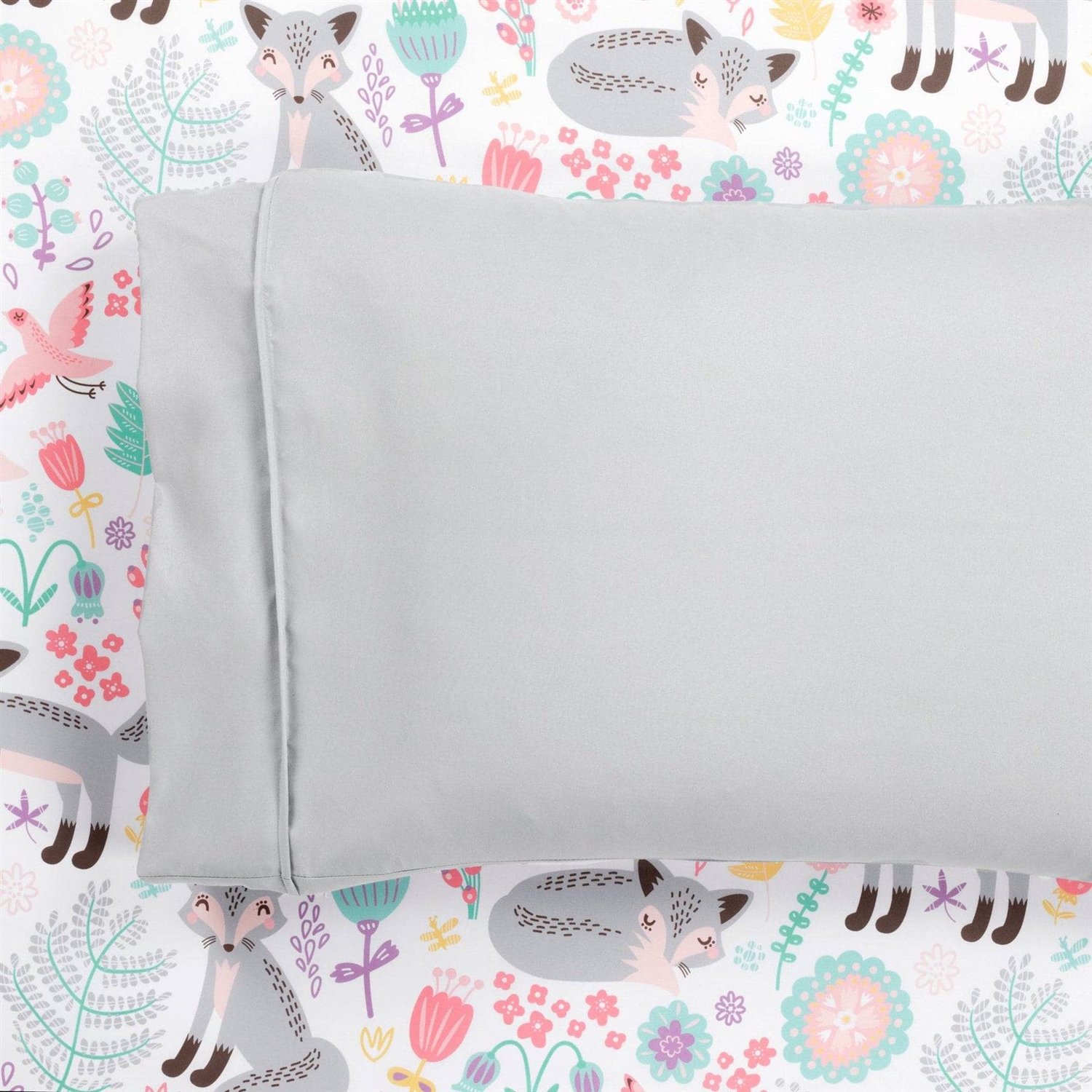 You'll love this whimsical sheet set for your kid's bedroom. Designed to keep your child cool and comfy all year long, this Twin Size Pink Grey Fox Soft 4 Piece Sheet Set is soft and built to last for many sleeps. Coordinate with the matching bedding set, throw and window treatments, or style independently. Decorate your child's bedroom by starting with the basics - the sheets. This complete Pixie Fox Soft Sheet Set is printed with whimsical woodland creatures and fun forest finds. Each piece of this set is made with naturally hypoallergenic fabric that is so soft to the touch. This Pixie Fox Soft Sheet Set is durable and will last many restful nights. Comfort is key with bed sheets, and this material is breathable and sure to keep your child at the perfect temperature throughout the night. The adorable and light hearted pattern printed on this Pixie Fox Soft Sheet Set pairs perfectly with its coordinating bedding set or it can be styled independently. A solid color textured bedding would also look lovely with these printed sheets. This Sheet Set includes 1 flat sheet, 1 fitted sheet, and two styles of pillowcases: one with matching print and one in solid color. The twin size is a 4-piece set with one of each. The fitted sheet has a 14-inch pocket.